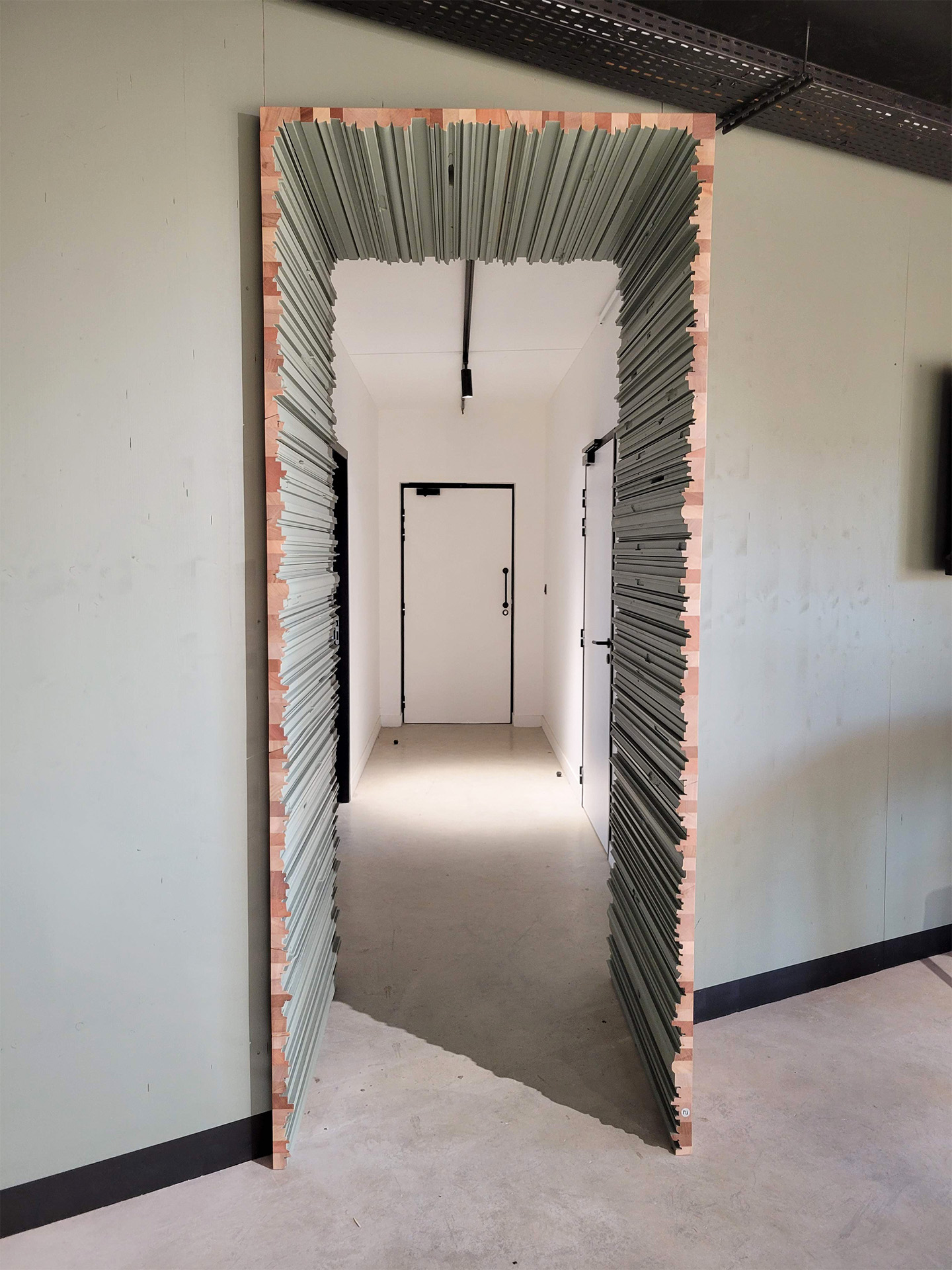 Embrasures de porte ou de fenêtre en bois rouge massif, conservant les découpes des profilés revalorisés.
